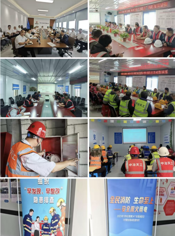 宣傳演練并舉,提升全員“戰斗力”。通過多措并舉,著力提升宣教培訓與應急處突實效。一方面,各項目充分利用橫幅、電子屏、工作群等載體,密集宣傳消防法規、安全規范及自救知識,營造出“人人關心消防、處處注意安全”的濃厚氛圍。同時,聚焦電焊工、電工等重點崗位及分包單位、新入場人員開展專項培訓,結合行業典型案例深度解析風險,明確動火審批、易燃品管理等要求。另一方面,堅持“貼近實戰、以練促防”原則,在各項目現場模擬“作業層動火”“生活區用電”等典型火災場景,組織開展應急演練。演練涵蓋報警、疏散、初期撲救及協同救援全流程,并特邀專業人員進行滅火器材實操指導,確保員工真正掌握“應知應會”,有效檢驗并提升了應急預案的可行性與團隊協作能力。