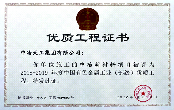 2018-2019年度中国有色金属工程(部级)优质工程-中冶新材料项目