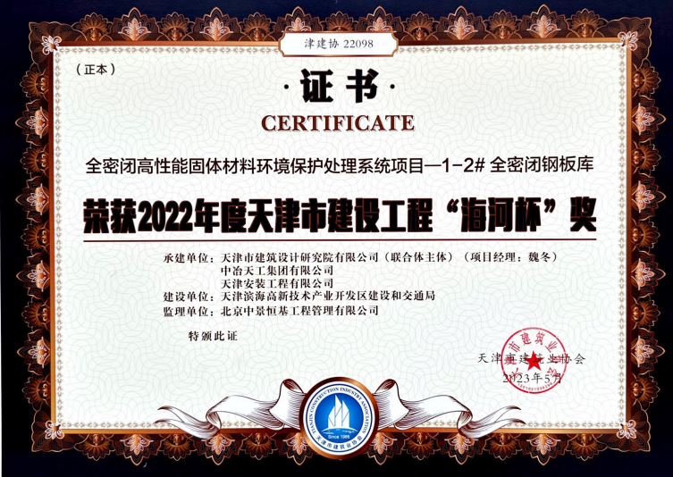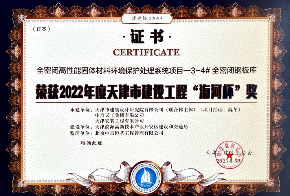 2022年度天津市建设工程“海河杯”奖—全密闭高性能固体材料环境保护处理系统项目