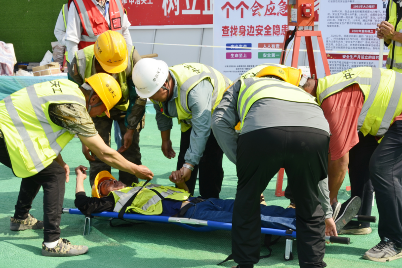 此次演練以施工現場觸電事故為背景,系統構建了從險情發生到全面處置的全流程應急響應體系。事故發生后,項目部第一時間啟動應急預案,各應急救援小組迅速集結,快速有序投入到救援工作當中,醫療救助組將觸電人員轉移至安全區域,并進行人工呼吸及人工心肺復蘇等急救救援;搶險救援組迅速切斷現場電源,帶領電工對現場進行全面排查,查看是否還有觸電危險;現場警戒組在事故現場周圍拉起警戒線,嚴防無關人員進出和拍攝,切實做好輿情控制工作;人員疏散組引導現場人員向應急避險處疏散,詳細清點檢查人員數量,確保不遺落任何一個人。整個演練過程組織嚴密、配合流暢,各環節銜接有序,充分展現了項目團隊的應急響應能力。