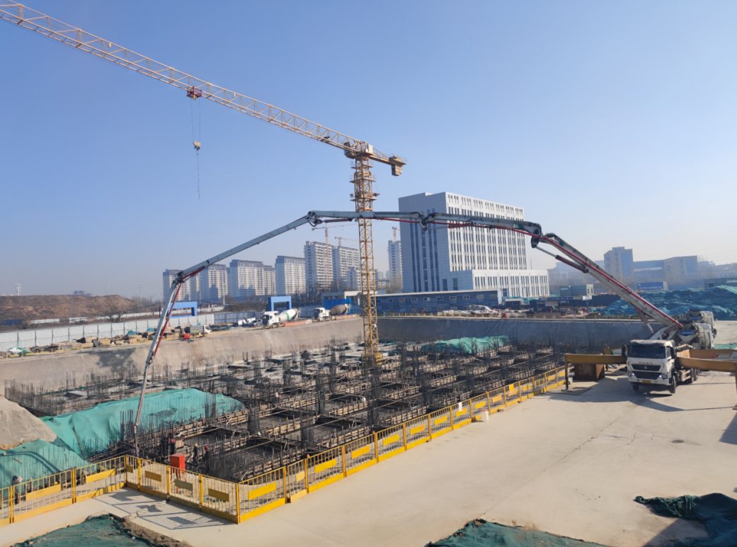 為保障此次基礎澆筑工作平穩有序推進,項目部嚴格遵守臨汾市重污染天氣橙色預警Ⅱ級應急響應的相關政策要求,結合項目實際施工條件,針對混凝土供應保障、運輸路線優化、現場揚塵治理、冬季施工防護等關鍵環節,進行了全面周密的部署安排。在澆筑過程中,項目管理人員全程旁站監督,對混凝土坍落度、試塊制作、澆筑工藝等關鍵環節進行嚴格把控,確保每一個施工細節都符合設計規范和質量標準,為工程質量筑牢了防線。