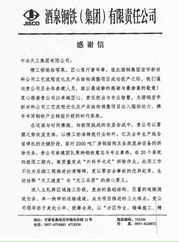 甘肃酒钢项目收到业主致中冶天工感谢信
