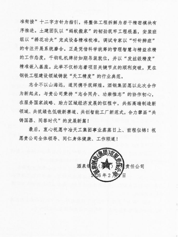 近日,工業工程公司甘肅酒鋼宏宇新材料工藝流程優化及產品結構調整項目收到酒鋼集團感謝信。信中對項目的成功投產給予高度評價,對公司展現的卓越匠心、責任擔當與專業智慧致以最誠摯的感謝與最崇高的敬意。