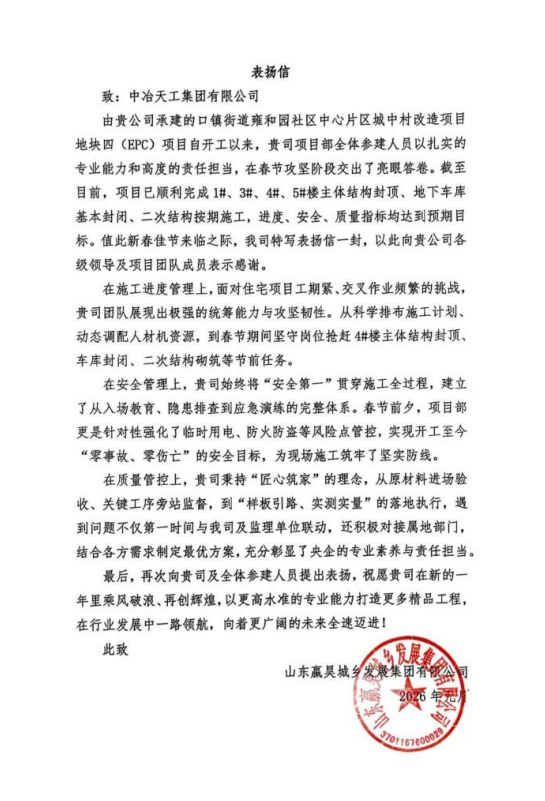 近日,由工業工程公司承建的山東省濟南市口鎮街道雍和園地塊四項目收到業主的表揚信,信中對項目在春節攻堅階段的卓越表現給予了高度肯定與誠摯感謝。