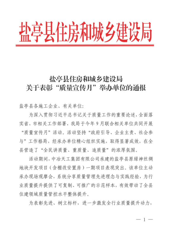 近日,南方公司承建的四川省綿陽市鹽亭縣原綠神絲綢地塊開發項目憑借卓越的質量管理成效、創新的實踐經驗及廣泛的行業示范作用,榮獲鹽亭縣住房和城鄉建設局通報表彰。